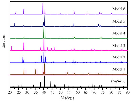 Comparison of XRD of Cu2SnTi3 and DFT simulated XRD of Models 1–6.