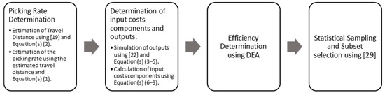 The data envelopment analysis is a non-parametric tool used to evaluate the relative efficiency of decision-making units (DMUs). It was first developed by Ref. [29] in their seminal work “Measuring the efficiency of decision making units”. Due to the few assumptions considered in DEA, it is an appropriate instrument for evaluating warehouse order-picking systems and policy sets. The warehousing literature lacks strong hypotheses about the warehousing production function and there is no reliable production function specification test [30].