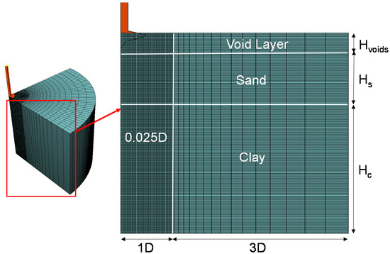 Finite element analyses using the CEL approach were performed using Abaqus/Explicit [25] to simulate penetrations of spudcan foundations with conical shapes with extruded spigots, the dimensions of which are reported in Hu et al. [12]. A 3D finite element model with an axisymmetric quarter domain was used for both the spudcan and soil, as shown in Figure 2. The spudcan was discretized with Lagrangian mesh using hexahedron elements (C3D8R). A rigid body constraint was assigned to prohibit relative deformation of the spudcan. The soil was modelled using the Eulerian domain hexahedron elements with reduced integration and hourglass control (EC3D8R). In the analyses, the soil mesh remained intact, whereas the soil materials were allowed to flow into or out of the Eulerian element. A layer of void elements above the top surface of sand layer was used to allow heaving of soil. The bottom of the soil domain was fixed in all translational degrees of freedom. The horizontal displacement constraints were applied at the lateral boundaries. The size of the computational domain is consistent with the Hu et al. [17] model. A uniform fine mesh for 1D around spudcan periphery was used, whereas a gradually increasing coarser mesh was extended to edges of the domain. The size of the smallest element used was 0.025D, which was selected from a sensitivity study, as displayed in Figure 3a.