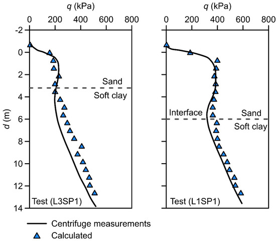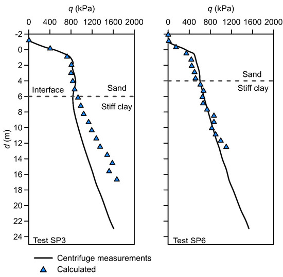 Comparison of penetration resistance profiles measured from centrifuge tests (sand over stiff clay) and calculated from FE analyses.