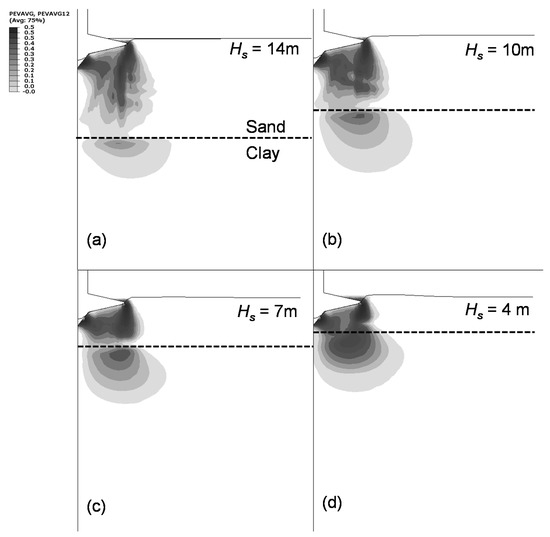 Plastic shear strain increment at qpeak, calculated for Hs/D = 0.7 and various combinations of ϕ′, su: (a) ϕ′ = 35°, su = 10 kPa, (b) ϕ′ = 35°, su = 60 kPa, (c) ϕ′ = 31°, su = 10 kPa, (d) ϕ′ = 31°, su = 60 kPa.
