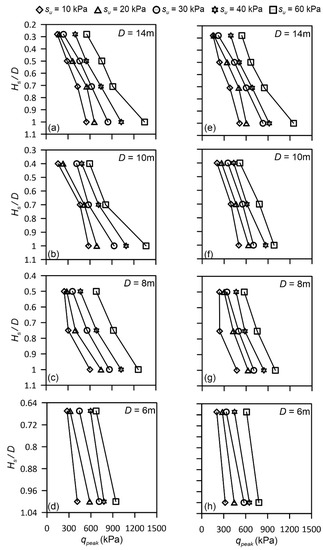 Figure 7 plots the variation of plastic shear strain traces with change in Hs/D. For Hs/D = 1, limited shear strain develops at the clay layer. The plastic shear strain and also the area of influence of the clay layer increase with a decrease in Hs/D ratio. Figure 6 and Figure 7 demonstrate that qpeak is influenced by Hs/D, ϕ′, and su. As for ϕ′, the influence is not as significant compared with the parameters Hs/D and su, because only loose to medium dense sand with ϕ′ ranging from 31 to 35° is considered in this study. Figure 8 shows the results of all calculated qpeak. qpeak is revealed to be positively correlated with Hs/D, D, ϕ′, and su. The calculated qpeak are compared with those estimated by theoretical models of Lee et al. [11] and Hu et al. [12] in Figure 9.