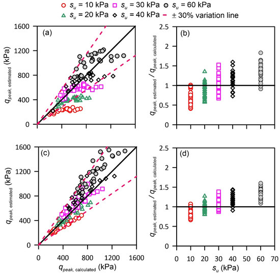 Comparison of calculated and estimated peak bearing resistance: (a,b) stress–dependent model Lee et al. [11], (c,d) modified stress model Hu et al. [12].