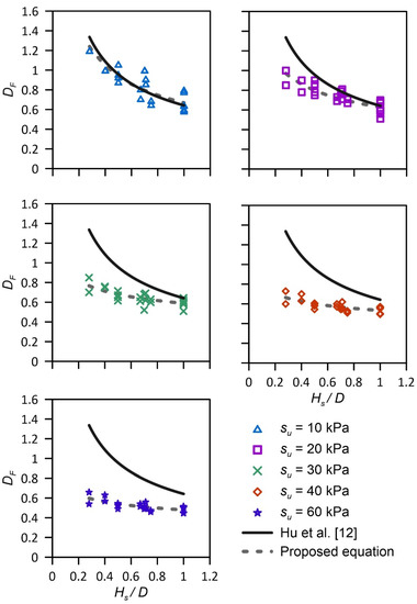 where d is the penetration depth. The applicable range of d is from 0.3Hs to Hs. The reported equation is not dependent on su. Figure 12 compares the calculated values of DF using Equation (12) and the empirical equation of Hu et al. [30]. The equation of Hu et al. [30] approximately falls between the calculated values for su = 30 and 40 kPa. Because the equation is not dependent on su, it does not capture the range of factors from soft to stiff clays well.