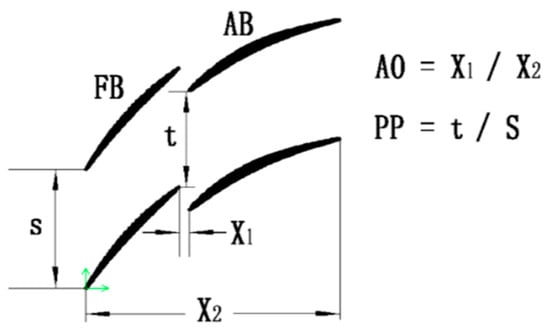 There are more degrees of freedom during the tandem blade design and optimization process, such as the relative position, the solidity ratio, and the camber ratio of FB and AB. It is necessary to investigate the extent of the optimal parameters, which has become a hot issue in recent years. Nezym [] et al. established mathematic models to assess tandem blade loss based on experiment results and investigated the mechanism of the flow affected by key design parameters. McGlumphy [,] et al. pointed out that the optimal relative position between FB and AB is AO ≈ 0 and PP ≈ 0.7~0.8. Baojie Liu [] presented a model to predict splitter blade minimum-loss incidence and deviation angle. This is a constructive effort to guide splitter blading design into becoming a conventional design process, which also provides a beneficial reference to developing an empirical model for tandem blades. In addition, Schlaps [], Schneider [], and Kumar [,] indicated that optimal design parameters may change in design and off-design conditions; for instance, a larger pitch-wise blade distance will lead to a simultaneous increase of the loss and choke margins [].