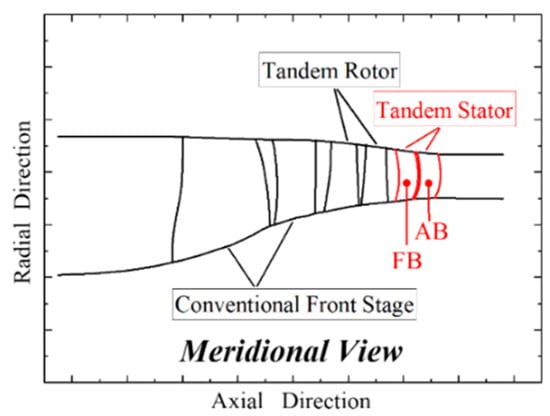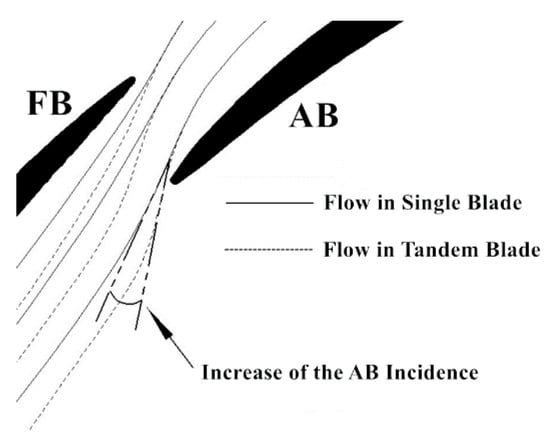 Earlier studies were launched to investigate the tandem blade potential performance advantages compared with conventional configurations. In the 1970s, high-loaded tandem blades were investigated by the Pratt and Whitney group using a single-stage test rig [,]. Bammert [,] optimized the multistage axial compressor with tandem blades, and the results showed that blade loss decreased approximately 20 percent relative to conventional blades. Smith [] summarized the physical mechanism of the multiblade system represented by tandem and splitter blades: the interaction between the two blades changes the distribution of circulations. For the tandem blade, the forward blade undertakes the whole incidence range and part of the aerodynamic load; the aft blade undertakes a higher load in a relatively stable operating condition.