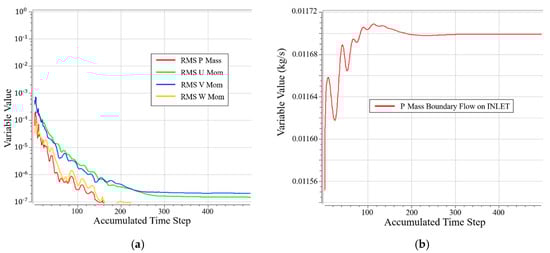 In this paper, numerical simulations were conducted on a double-stage transonic compressor with tandem blades and a 2D tandem blade model was derived from the 50% blade height of this compressor. The configuration of the compressor and the 2D tandem blade model in the meridional view is shown in Figure 2. The main design parameters, such as AO/PP, solidity ratio, and camber ratio, were modified during the primary design process. The numerical simulation solver was ANSYS 15.0, which uses an element-based finite volume method and an implicit discrete-in-time scheme based on Reynolds-averaged Navier–Stokes (RANS) equations, using a k-ε turbulence model; k is the turbulence kinetic energy, and ε is the turbulence eddy dissipation (the rate at which velocity fluctuations dissipate). The continuity and momentum equations are shown as Equations (1) and (2), where SM is the sum of body forces, ueff is the effective viscosity accounting for turbulence, and p’ is the modified pressure, as defined in Equation (3) [,]. The convergence of the simulation for the 2D tandem blade model is shown in Figure 3. The mass flow and momentum residuals decline by three orders of magnitude, and the inlet mass flow rate becomes stable in outlet value. Mesh independence and validation has been done in previous research to improve simulation accuracy [].