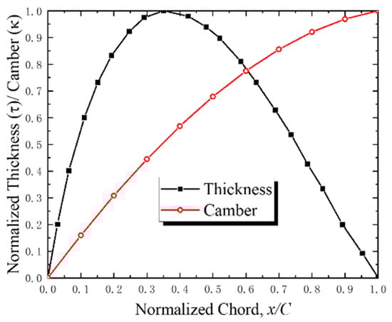 The baseline 2D tandem blade design parameters are shown in Table 1. Considering the inflow Mach number of 0.8 at the DE (design) point, the CD airfoil was selected for both FB and AB. The camber line and thickness distributions are shown in Figure 4.
