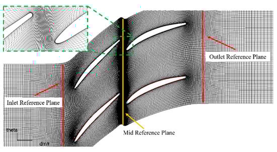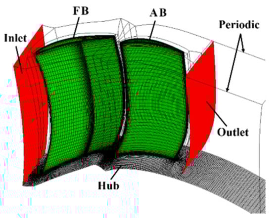 An HOH topology structured mesh was generated in blade-to-blade surface with the AutoGrid5 software package, as shown in Figure 5. The total grid number was about 195,000 (the number along the axial; circumferential and spanwise: 305 × 71 × 9), and there were 91 grids along the chord-wise of FB and AB. The first nondimensional wall distance was specified to ensure that y+ was less than 5, and the grid expansion ratio near the wall was kept at less than 1.2.