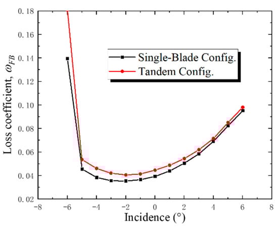 The baseline FB was simulated in single-blade and tandem configurations, and its behavior, influenced by the AB, was analyzed. Comparison of FB blade performance in two configurations is shown in Figure 7 (the reference plane was kept in the same position). The FB blade loss increases by approximately 8% in the tandem configuration. Nevertheless, the incidence range is almost the same, i.e., the incidence range of tandem blades is mainly decided by FB.