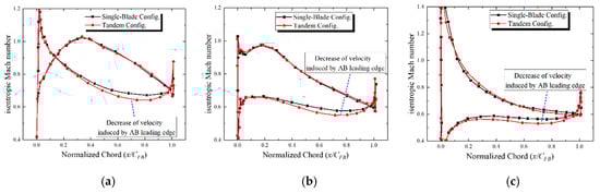 Comparison of the AB isentropic Mach number in single-blade and tandem configurations. (a) Incidence = −5°; (b) incidence = −1°; (c) incidence = +5°.
