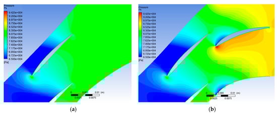 To further understand the reason that leads to the increase of blade loss in the tandem configuration, the comparison of isentropic Mach number distributions in three typical operating conditions is shown in Figure 8. The distributions in the single-blade configuration are similar to the CD airfoil. However, in the tandem configuration, the airflow decelerates near the PS trailing edge and the aerodynamic load increases near the FB PS trailing edge, which makes the isentropic Mach number distributions deviate from the ideal profile of CD airfoils. As shown in Figure 9, the stagnation effect of AB leads to a change in the static pressure field near the AB leading edge, and it can be regarded as an additional pressure field induced by AB. In the present relative position of FB and AB, the FB trailing edge is located in a high-pressure region caused by AB, which influences the FB isentropic Mach number distributions and causes a further increase of blade loss. It should be emphasized that static pressure changes rapidly near the AB leading edge; therefore, the effect of the additional pressure field is obviously influenced by FB and AB’s relative position. Hence, it is necessary to select a proper relative position before the elaborate optimization.