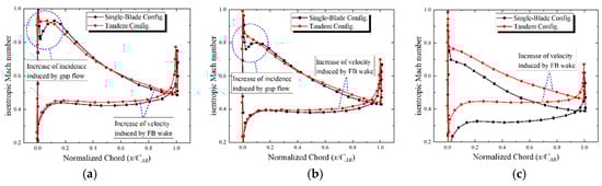 Comparison of the FB isentropic Mach number in single-blade and tandem configurations. (a) Incidence = −5°; (b) incidence = −1°; (c) incidence = +5°.