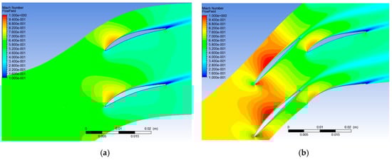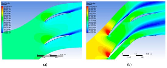 Mach contours near the blade surface at 80% design speed at the CO point. (a) Original; (b) modified.