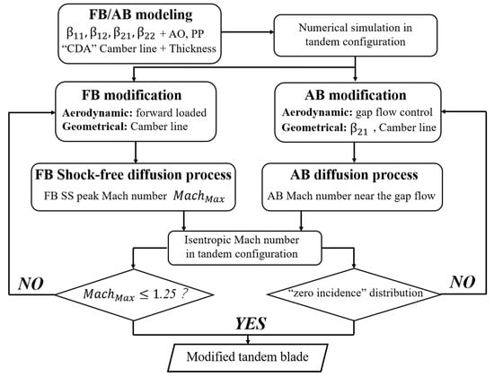The simulation results for a baseline 2D tandem blade indicate that the typical CD airfoil achieved acceptable overall performance. However, some potential, improving directions are still being reflected in the comparison of isentropic Mach number distributions in single-blade and tandem configurations. It should be noted that the design parameters, such as AO/PP, solidity ratio, and camber ratio, were selected during a proper interval in the preliminary design, and they are kept fixed during the optimizing process. The camber line and blade angle were modified to adapt to aerodynamic interaction better in tandem blades, with the objective of reducing total pressure loss while maintaining the aerodynamic load. Based on proper preliminary design parameters and the CD airfoil, the modification process for tandem blades and the critical aerodynamic criteria can be summarized in Figure 14. The modification concepts for FB and AB will be discussed in the following parts, respectively.