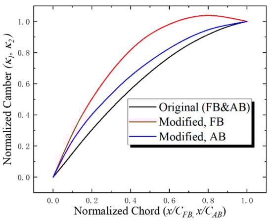 As mentioned in the previous analysis, the FB diffusion process is influenced by the AB pressure field in the tandem configuration, as characterized by the increase of the aerodynamic load near the FB trailing edge. To better adapt to the aerodynamic interaction, a negative camber is adopted near the FB trailing edge, which leads to a reduction in the local aerodynamic load. Normalized camber line distributions of the modification blade are shown in Figure 15; the normalized camber increases in correspondence with the normalized chord length, varying from 0 to 0.5. Additionally, a negative camber line is used from 0.7 to 1.0 normalized chord length.