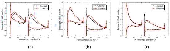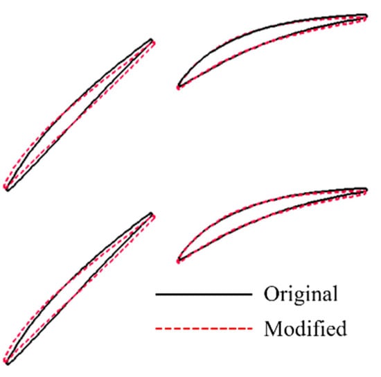 Due to AB being located in the rear of FB, the impact of gap flow is more significant. Additionally, the aerodynamic interaction should not be ignored during the modification process. Firstly, to make the AB incidence adapt to the influence of gap flow, the modified AB inlet metal angle decreases by 5°. The criterion of “AB incidence modification” can be estimated by the AB surface isentropic Mach number; that is, AB should form a “zero incidence” distribution in the tandem configuration. Secondly, to ensure a stronger converging passage between FB and AB, the normalized camber increases more rapidly before 30 percent of the chord length, which is beneficial for preventing the separation near the AB trailing edge. A comparison of baseline and modified blade geometry is shown in Figure 16.