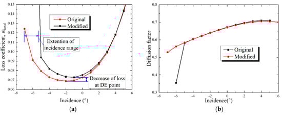 Comparison of baseline and optimized blade performances. (a) Incidence—loss coefficient; (b) incidence—diffusion factor.