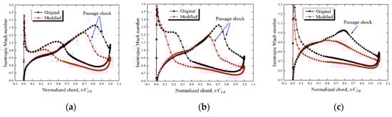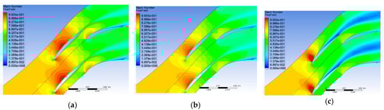 FB surface isentropic Mach number at 100% design speed at the DE point. (a) 10% blade height; (b) 50% blade height; (c) 90% blade height.