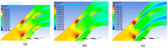 Baseline blade Mach contours in typical operating conditions. (a) i = −5°; (b) i = −1°; (c) i = +5°.
