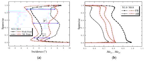 As is known to compressor designers, the challenge of a multistage compressor at low speeds is that the rear stages cannot pass through enough mass flow to prevent the front stages from stalling []. Since the tandem stator is located at the rear stage, a tandem airfoil with a wider incidence range is of great importance for the matching characteristic of the double-stage transonic compressor at low speeds. Based on the above analysis, the following two challenges are explained for further understanding of the tandem stator optimization in this paper. Firstly, the radial distribution of tandem stator incidence at design speed and off design speed are presented in Figure 21a, which determines the essential incidence range from hub to tip, varying from 6° to 10° correspondingly. That is, a nonoptimized tandem stator with a smaller incidence range may lead to double-stage compressor performance deterioration (difficulty in stage-matching at low speeds or an early corner stall before the rotor achieves its maximum pressure rise at design speed). Secondly, as shown in Figure 21b, the inflow Mach number, along the spanwise, varies from 0.95 to 0.8 at design speed. The shock wave in FB seems inevitable with such a high inflow Mach number; consequently, the optimization using the camber line modification method should be finely balanced on blade loss and incidence range.