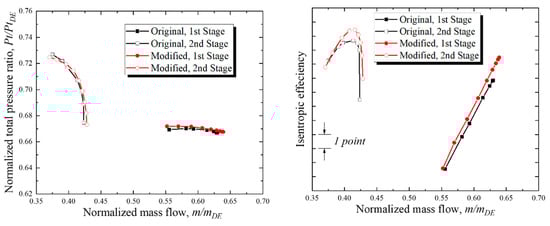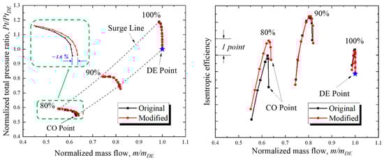 The comparisons of baseline and optimized compressor characteristics, normalized by the results at the DE point, are shown in Figure 22. The effect of tandem stator optimization on pressure rise and efficiency is negligible at design speed. However, the compressor characteristic is obviously modified at 80% design speed: the efficiency increases approximately 2 points at the CO (cooperating) point, with an overall improvement along the equal engine speed line. Additionally, mass flow rises nearly 1.6% at the choke point. The characteristics of the front and rear stages at 80% design speed are shown in Figure 23; both the efficiency and mass flow of each stage increase significantly in the whole operating conditions. Note that compressor performance improvement benefits from the modification of the tandem stator only, which indicates that the flow capacity enhancement of the tandem stator has a great impact on the matching characteristic of the double-stage transonic compressor at low speeds.