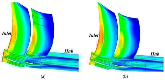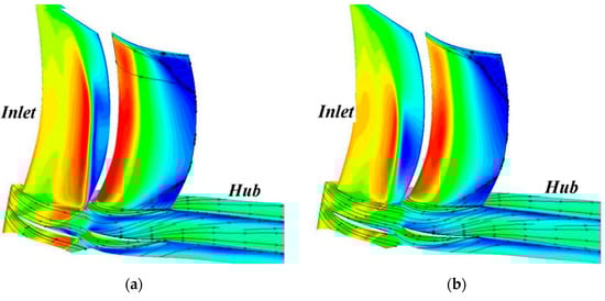 Figure 17 presents the comparisons of tandem blade performances (incidence—total pressure loss and incidence—diffusion factor characteristics) between the baseline and optimized blades, with an inflow Mach number of 0.8. The total pressure loss at the DE point decreases by about 6%, and the incidence range extends 2° while maintaining the aerodynamic load.