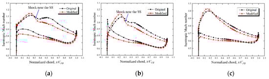 As shown in Figure 20, the isentropic Mach number distributions reveal that the optimized blade achieves a typical CD airfoil shape in three operating conditions.