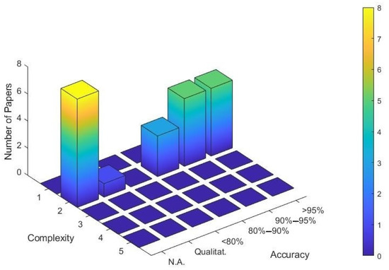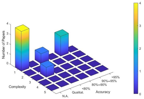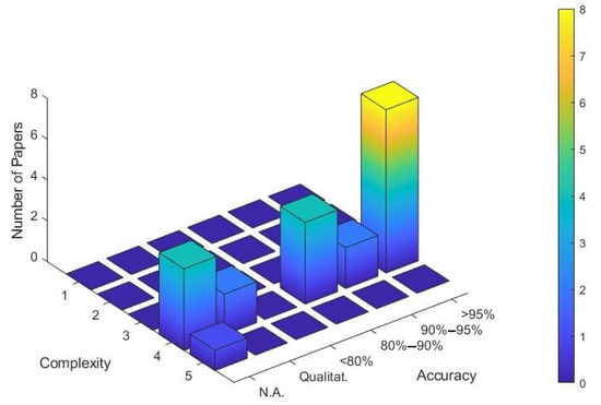In particular, for each CFD approach, it was shown the number of studies that deal with a specific complexity in the modelling and obtain a specific accuracy of the results. For example, this kind of results shows that GRA is capable of simulating very complex systems (e.g., cycloidal and planetary gearboxes) obtaining particularly accurate results. While OG is mainly applied for simulating medium-high complex system (e.g., engaging spur gears) obtaining generally medium-high accuracy (80%–90%). Very good levels of accuracy and complexity can be achieved also through LRA and RMM/MSL approaches. However, LRA is able to simulate the engaging gears while RMM/MSL approaches are not.