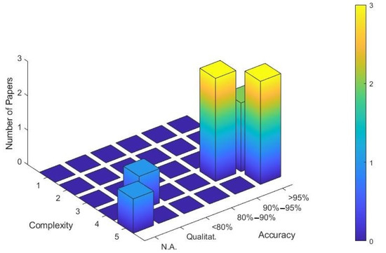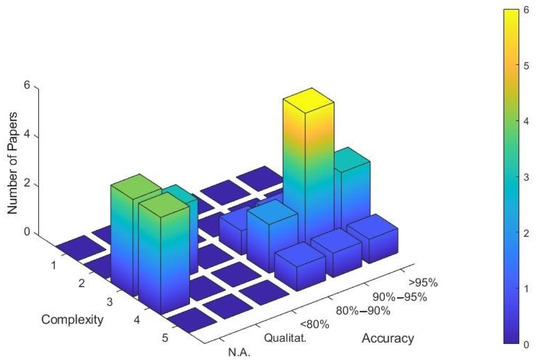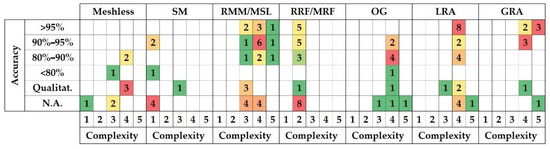 Figure 8, the number of studies that achieve a specific combination of accuracy of the results and complexity of the modelling can be seen subdivided per each approach. In the figure, it is clear that different approaches tend to perform differently in terms of complexity and accuracy. For instance, the GRA tend to get the greatest levels of accuracy and complexity. The LRA usually achieve a high level of accuracy but it is applied mainly for a medium-high level of complexity. The same level of complexity that can be simulated through OG but, usually, obtaining a lower level of accuracy. RRF/MRF approaches are characterized by a medium-low level of complexity and a wide range of level of accuracy. Through RMM/MSL medium-high level of both complexity and accuracy can be usually achieved. Most of the results concerning SM were not validated and, however, this approach is characterized by a low level of complexity. Eventually, meshless approaches are able to simulate complex system but the results could be accurate only at a qualitative level.