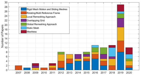 Figure 9, it is possible to notice that some approaches such as RMM/MSL and MRF and, to a lesser extent, LRA have been used continuously over the last decade. Other approaches, such as GRA and meshless approaches, are increasing their widespread use, especially in the most recent years. Moreover, the SM approach is used mainly in the most recent years.
