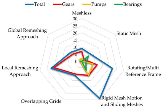 Figure 10, through a spider diagram, it is shown (for each approach) the number of papers studying specific mechanical system, i.e., gears, bearing or pump. In the diagram, it is possible to notice that almost all the works carried out through remeshing strategies aims at studying gears. Pumps are mainly simulated exploiting RRF/MRF and RMM/MSL approaches. Eventually, components of bearings have been studied through the SM approach or RMM/MSL approaches. In addition, as mentioned in the previous sections, RMM/MSL is the most exploited approach.