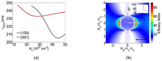 On the other hand, for nearly flat profiles, it is evident that due to the different dielectric parameters and optical masses of TiO2 for (001 and (100), a larger range of ΛSPP values for (100) is predicted (~205 nm) compared to the computed value (~232 nm) for (100). The minimum values of ΛSPP occur for ~27 × 1022 cm−3 (001) and ~44 × 1022 cm−3 (100), respectively.