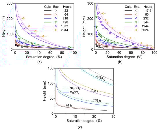 Figure 3 shows the changes in the concentration profile of various single-electrolyte salts at different times when they were dissolved in static water. Generally, although the dissolution of a soluble salt is slow, it does occur in static water. In static water, the dissolution equilibrium time of soluble salts may be as long as one year [9]. In the case of unsteady diffusion, the solute has a normal profile [27] that reflects the concentration gradient, and this is suitable for calculations made using Fick’s second law [28]. Except for subtle differences, the diffusion trends of MgSO4 and Na2SO4 are roughly similar, as shown in Figure 3a,b, respectively. To directly compare the diffusion behaviors of MgSO4 and Na2SO4 in aqueous solution, Figure 3c shows the calculated results of their saturation degree profiles at different diffusion times. Because the change in solute concentration or saturation degree is mainly caused by solute diffusion, it is concluded from the saturation degree that the diffusion ability of Na+ is slightly stronger than that of Mg2+. Compared to Mg2+, in the process of cation diffusion, the atomic weight of Na+ is smaller, the atomic radius is smaller, and the valence is lower; thus, the hydration ability of Na+ is weaker than that of Mg2+, and this leads to the smaller diffusion resistance. From this rule, the Na2SO4 components diffuse slightly faster than MgSO4, as shown in Figure 3c. This phenomenon is more obvious when the diffusion time is long.