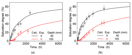 The difference between the experimental (Exp.) and calculated (Calc.) results in Figure 3a,b is due to the deviations in the calculation process. According to Equations (1)–(9), it is assumed that the parameters (e.g., DAB) are not accurate as expected, which makes the makes the calculation error larger at longer durations of dissolution and diffusion. However, the calculation is still reliable in practice because the calculated results are close enough to the experimental data even after nearly 3000 h of diffusion.