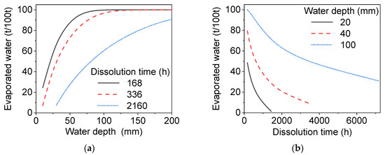 Figure 6 and Figure 10 provide references for actual solution mining. If the water source is sufficient, the dissolution can be stopped at 720 h and new fresh water can be introduced to continue solution mining, because the increase in concentration of resulting solution begins to slow down after 720 h of dissolution. However, the disadvantage of this solution extraction method is that the subsequent evaporation and crystallization processes consume more water. Figure 11 shows the amount of water that must be evaporated when the resulting solution is concentrated to a saturated state and begins to precipitate salt product under the conditions of different dissolution times and water depths. The results shown in Figure 11 are related to the technological economy of the dissolution and salt production processes; it is expected that the amount of evaporated water decreases so that the enthalpy consumption of the production process is also reduced. Figure 11a shows that as the depth of dissolving water increases, the amount of water that must be evaporated in the subsequent evaporation process also increases. As seen in Figure 11b, when the optimized brine depth is 40 mm (Figure 7), the required amount of evaporated water decreases roughly linearly with respect to time within the first 720 h; when the dissolution time is more than 720 h, the amount of evaporated water generally tends to be stable with respect to time, and this indicates that it is meaningless to extend the dissolution in terms of process optimization. When the dissolution time is long, such as from autumn to the following spring, it is better for the dissolution time to be controlled to be about 2160 h, because the amount of evaporated water is not further reduced even if the dissolution time is further extended. The information provided in Figure 11 can be used as a quantitative reference for industrial dissolution mining processes.