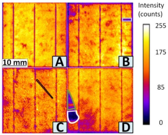 EL cell images inflicted with different faults: (A) no failures; (B) finger failures (region marked with light blue); (C) micro-crack Mode A (black); (D) cracks Mode B (olive green) and Mode C (white).