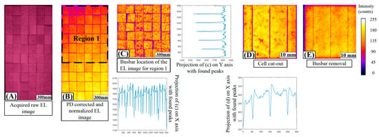 The image processing procedure used in this study: (A) acquired raw EL measurements; (B) the prospectively corrected normalized image; (C) busbar identification; (D) solar cell extraction; and (E) busbar removal.
