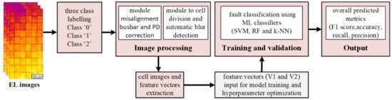 - Fada, J.S.; Hossain, M.A.; Braid, J.L.; Yang, S.; Peshek, T.J.; French, R.H. Electroluminescent Image Processing and Cell Degradation Type Classification via Computer Vision and Statistical Learning Methodologies. In Proceedings of the 2017 IEEE 44th Photovoltaic Specialist Conference (PVSC), Institute of Electrical and Electronics Engineers (IEEE), Washington, DC, USA, 25–30 June 2017; pp. 3456–3461. [Google Scholar]
