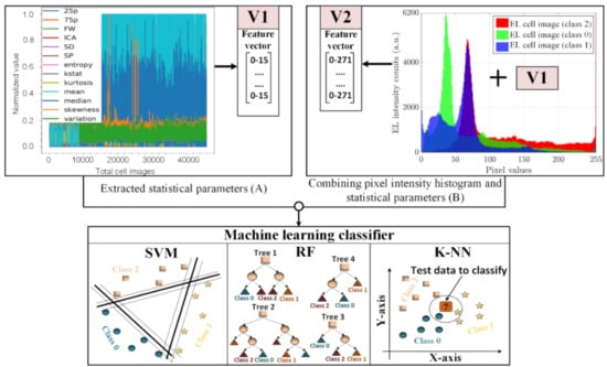 Figure 3 presents the procedure used in this study. This study’s focus is on the selection of the feature vector (gray box in the diagram). The EL intensity of each of the pixels is used to determine the intensity distribution across the image. Different derived statistical parameters are then calculated based on the 1D pixel intensity histogram of high-resolution images (see Table A1). The proposed feature vector V1 contains 16 statistical parameters reducing the feature vector’s dimension by encoding the information into a smaller latent space to remove the redundant information from the data. This allows an efficient and fast process compared to the traditional methods, which use the 2D spatial information to identify the image’s defects. Finally, the developed feature vectors (V1 and V2) are used as an input for the three ML classifiers, as shown in Figure 4, for classifying the defects in the images.