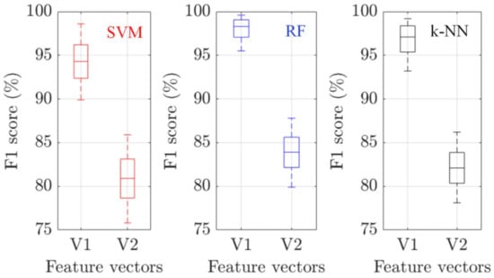 Figure 5 compares the F1 scores of the two feature vectors when they are used as inputs to the three ML classifiers (SVM, RF, and k-NN) of the validation set. The validation has been repeated five times to extract statistical parameters. In all cases, the proposed vector (V1) outperforms the combined approach (V2), achieving higher F1 scores with lower variance. Hence, it can be concluded that the larger number of pixel intensity features in the case of V2 (256) masks the unique features (16) that are used by V1, substantially reducing the performance of the ML classifiers. No significant difference can be observed between different ML algorithms. Note that a comparison between the training and validation sets indicates that the data has not been over-fitted.