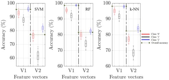 Figure 6 also displays the computed accuracy for each of the computed ML classifiers. The overall accuracy values (see Table 3) give an unbiased estimate for correctly predicting the images’ actual class labels from the final tuned algorithm. It should be noted that the weighted average accuracy of all the classes (92.1% (SVM), 95.4% (RF), and 94.9% (k-NN)) is lower than the overall accuracy (96.7% (SVM), 99.2% (RF), 98.4% (k-NN)) for the V2 feature vector. It gives equal contributions to the three classes’ predictive performance, which are independent of their number of observations, unlike those used to compute the overall accuracy. The V1 feature vector’s overall accuracy indicates that the overall performance is high compared to that of the V2 feature vector, even though the classifiers underperform in the individual class 1 of all three classes. Furthermore, other output metric parameters (precision, recall, true positives, false positives and more) are calculated (see Figure A1) and the performance of the developed vectors are evaluated.