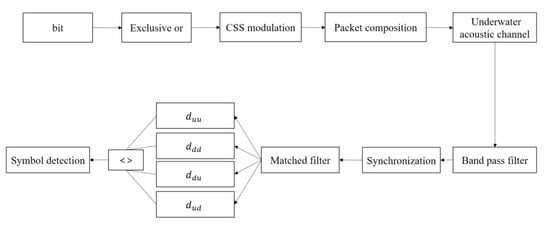 The performance of CSS communication was determined by the process gain of the matched filter. The proposed method is to increase the process gain of the matched filter when the data rate is constant, and differential coding is used as a way to increase the time–bandwidth product cost. We increased the amount of time–bandwidth product by using two symbols to demodulate using the current symbol and previous symbol. Details of these methods are explained in Section 3.
