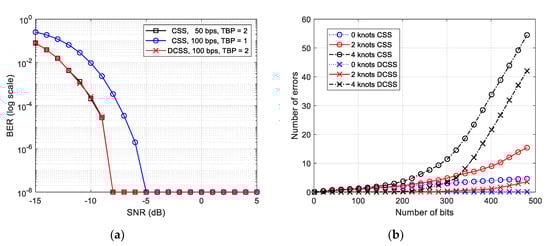 The parameters used in the simulations are represented in Table 2. Through repeated simulations with these parameters, the simulation was conducted with a total of bits. The results are shown in Figure 4a,b. Figure 4a shows the difference in performance of each method according to the SNR. First, the black square is the conventional CSS method with a transmission rate of 50 bps, and the blue circle is the conventional CSS method with a transmission rate of 100 bps. Assuming that the TBP of 100 bps is 1, the TBP is 2 because the TBP is doubled at 50 bps, where the transmission rate is half. Finally, the red scissors are a DCSS method with a transmission rate of 100 bps, and since the matching filter is formed using two symbols, the TBP becomes 2. Figure 4b shows the error accumulation rate according to the speed. This was used to analyze the performance according to the error accumulation degree in the Doppler environment. The blue dotted line is 0 knots, the red solid line is 2 knots and the black dashed line is 4 knots; the circled line is the conventional method and the proposed method is indicated by the scissors mark. It was confirmed that the performance of the proposed method in the figure is more durable due to Doppler than the conventional method.