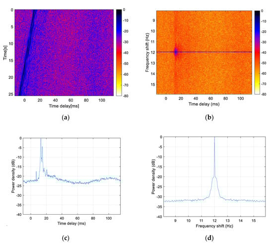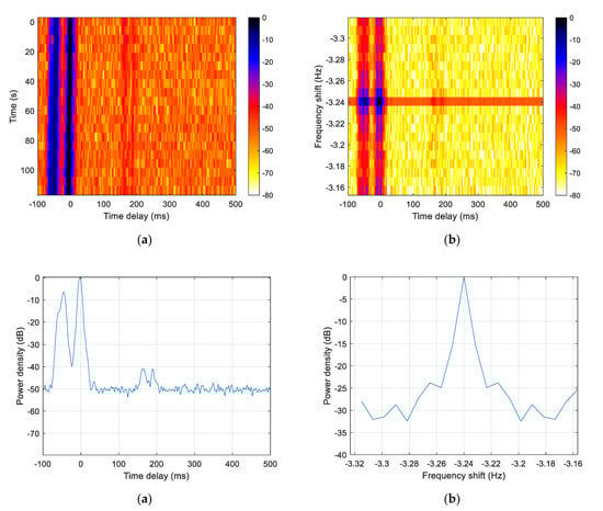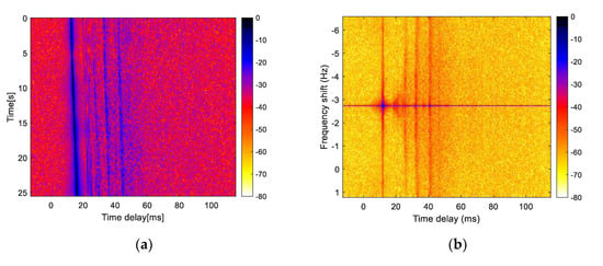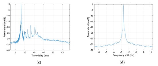 Before checking the results of the sea experiment, the channel was measured. The CIR is shown in Figure 10. The channel has one big multipath, which was reached before the main path. The delay was about 50 ms and there was about −3.24 Hz Doppler.
