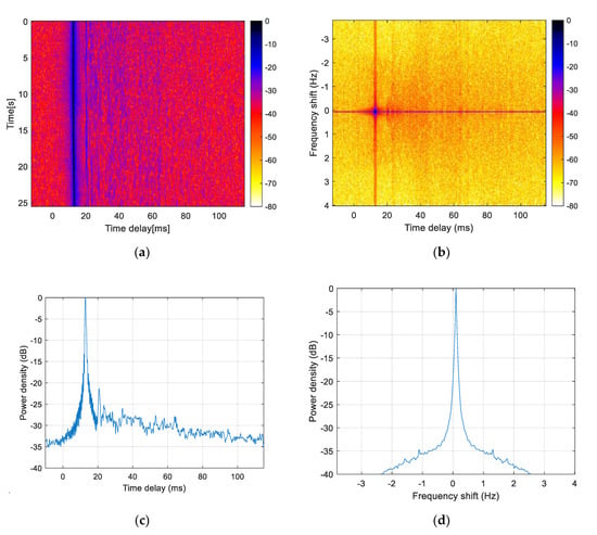 The characteristics of each experiment are expressed in Figure 5, Figure 6 and Figure 7. Figure 5a, Figure 6a and Figure 7a represent the CIR of each experiment; Figure 5b, Figure 6b and Figure 7b represents the delay-Doppler spread spectrum of each experiment; Figure 5c, Figure 6c and Figure 7c is the power delay profile; and Figure 5d, Figure 6d and Figure 7d is the Doppler power spectrum.