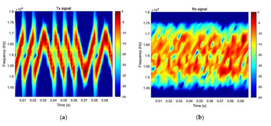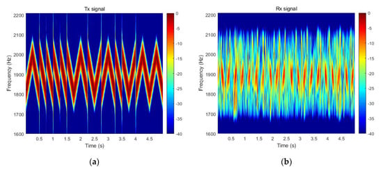 The spectrogram of (a) the transmitted signal and (b) the received signal.