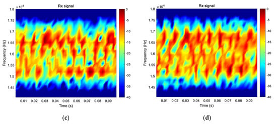 The spectrogram (a) of the transmitted signal; (b) received signal on the 1st experiment; (c) received signal on the 2nd experiment; (d) received signal on the 3rd experiment.