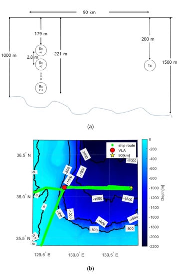 A sea experiment was conducted in October 2018 in the East Sea, South Korea. The experimental configuration was constructed as shown in Figure 9, and the experiment was conducted from a vertical line array (VLA) of about 90 km. The water depth was ~1500 m. The experimental configurations are shown in Table 5. The source, a Neptune T-161 projector, was located ~200 m below the sea surface and transmitted signals over the 1.8 kHz centered frequency [31]. The 16-element receiving hydrophones were located 179–221 m away under a sea surface buoy. This is a vertical line array (VLA) with an inter-element spacing of 2 m. The collected acoustic data, as well as some of the collected oceanographic data, were self-recorded, providing the VLA coordinates by continuous real-time monitoring via a telemetry buoy; this is represented in Figure 9a. The map in Figure 9b shows the geography of the East Sea. In Figure 9b, the circle is the receiver, the star shape represents the position of the transmitter and the line drawing between the star and circle is the chip route measured by a global positioning system (GPS).