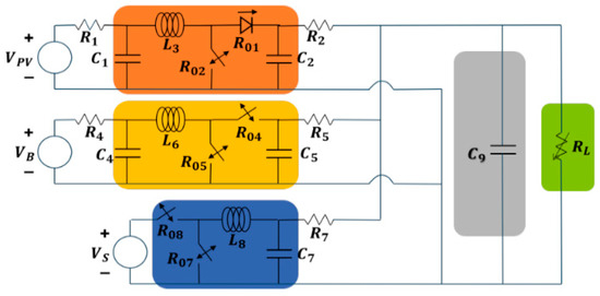 According to Figure 2, the PV system is connected to a dc bus via a dc-dc converter. The measured variables are and , that are the L3 inductor current, and the C1 and C2 capacitors voltage, respectively. The control input is a voltage, to control the output voltage of the PV system. The battery is also connected to a dc bus through a dc-dc converter. The measured variables are and , that are L6 inductor current, C4 and C5 capacitors voltage, respectively. The control input is also a voltage, to control the battery output voltage. The capacitor bank is also connected to a dc bus through a dc-dc converter. The measured variables are and , that are L8 current and C7 voltage, respectively. The control input is also a voltage to control the output voltage of the capacitor bank.